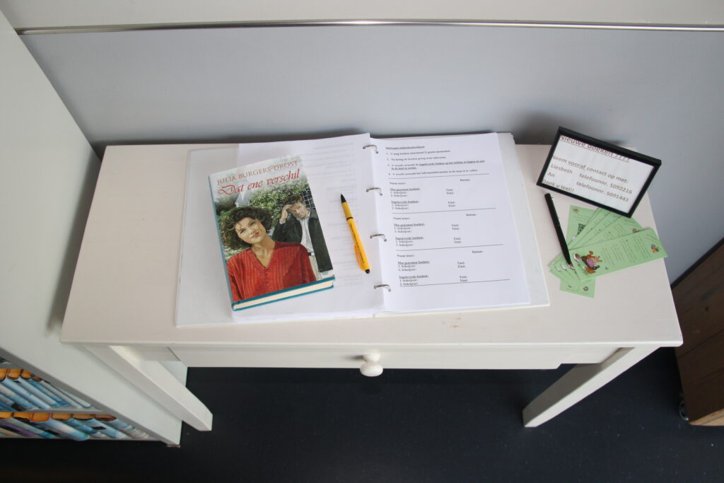 Je mag kosteloos twee boeken per keer lenen. Je tekent deze zelf af in de map en na lezing lever je de boeken hier weer in. Het boekenruilpunt  beschikt ook over een aantal grootlettertype boeken.